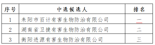 衡糧集團庫區(qū)白蟻防治服務項目(比選編號BX-015)于2025年10月20日下午14點30分進行了比選活動。經(jīng)評審小組綜合評審,現(xiàn)將中選候選人排名結果公示如下: